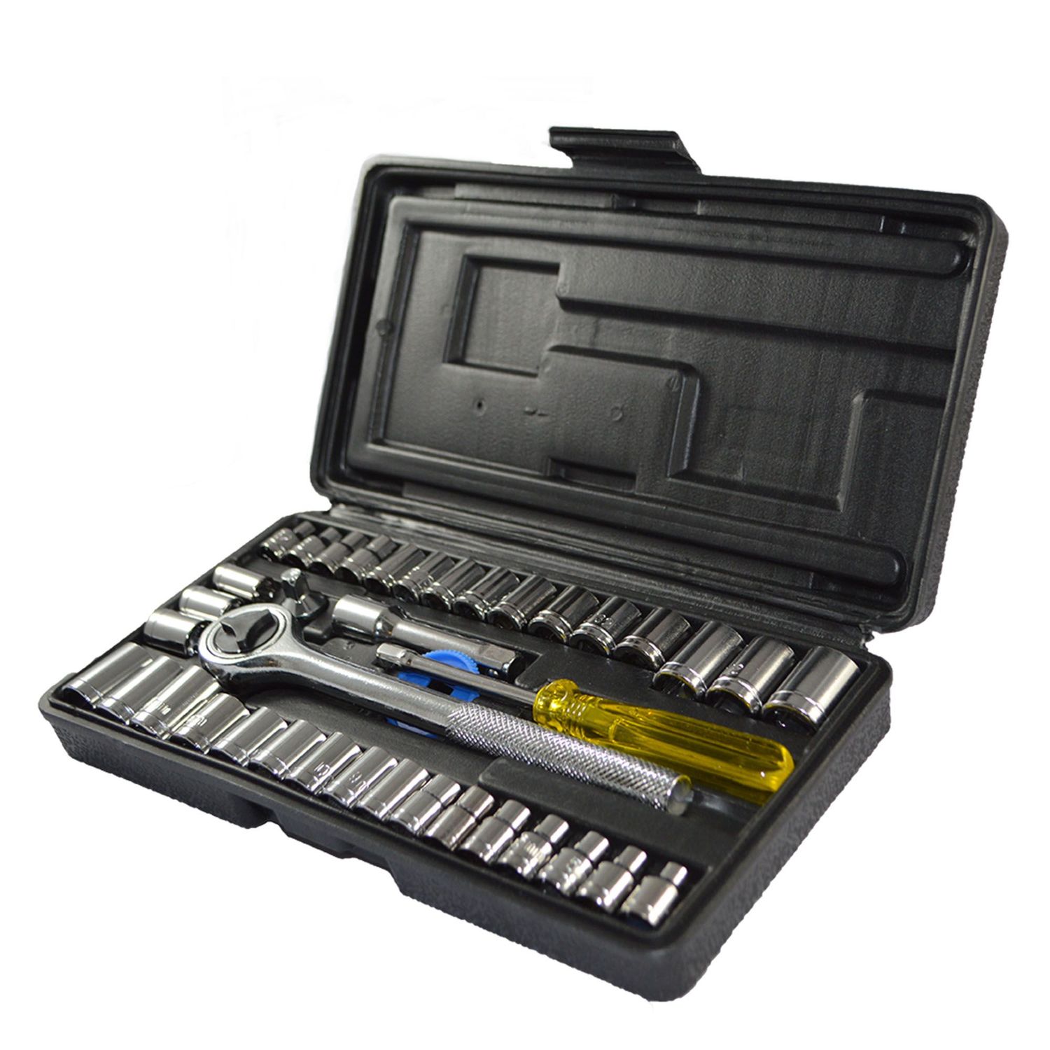 Este juego de herramientas de tipo trabajo liviano incluye 40 piezas, entre las que se encuentran copas milimétricas y en pulgadas, además de copas octogonales. El juego cuenta con un atornillador manual de 1/4" y adaptadores de 3/8" para usar las copas con ratchet. El largo del juego es de 13 cm, lo que lo hace compacto y fácil de guardar.